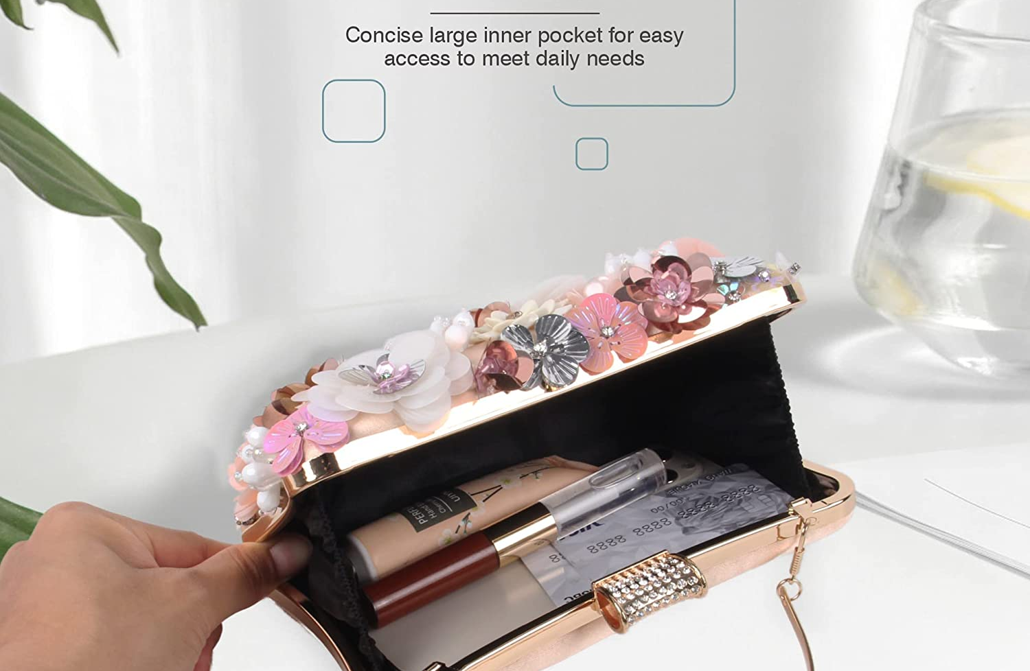 Promising review: "I like this purse. It's perfect for going out. It would make a cute prom purse as well. It's pliable enough to fit your things in. See photos of what I put in mine. There's space for your phone, keys, lotion, etc. I also like the strap. It's not a full length strap. The length of the strap is perfect to keep the purse close to your body, while allowing your hands to remain free. I love all the little rhinestones on it." —MK