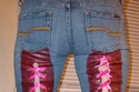 Looking beyond the very obvious appearance of When Sleazy Meet Trashy, these “corset jeans” make me want to track down this girl’s mother, and hold in contempt for crimes against crafting. Spray pant on jeans? Corset-wrapped thighs?