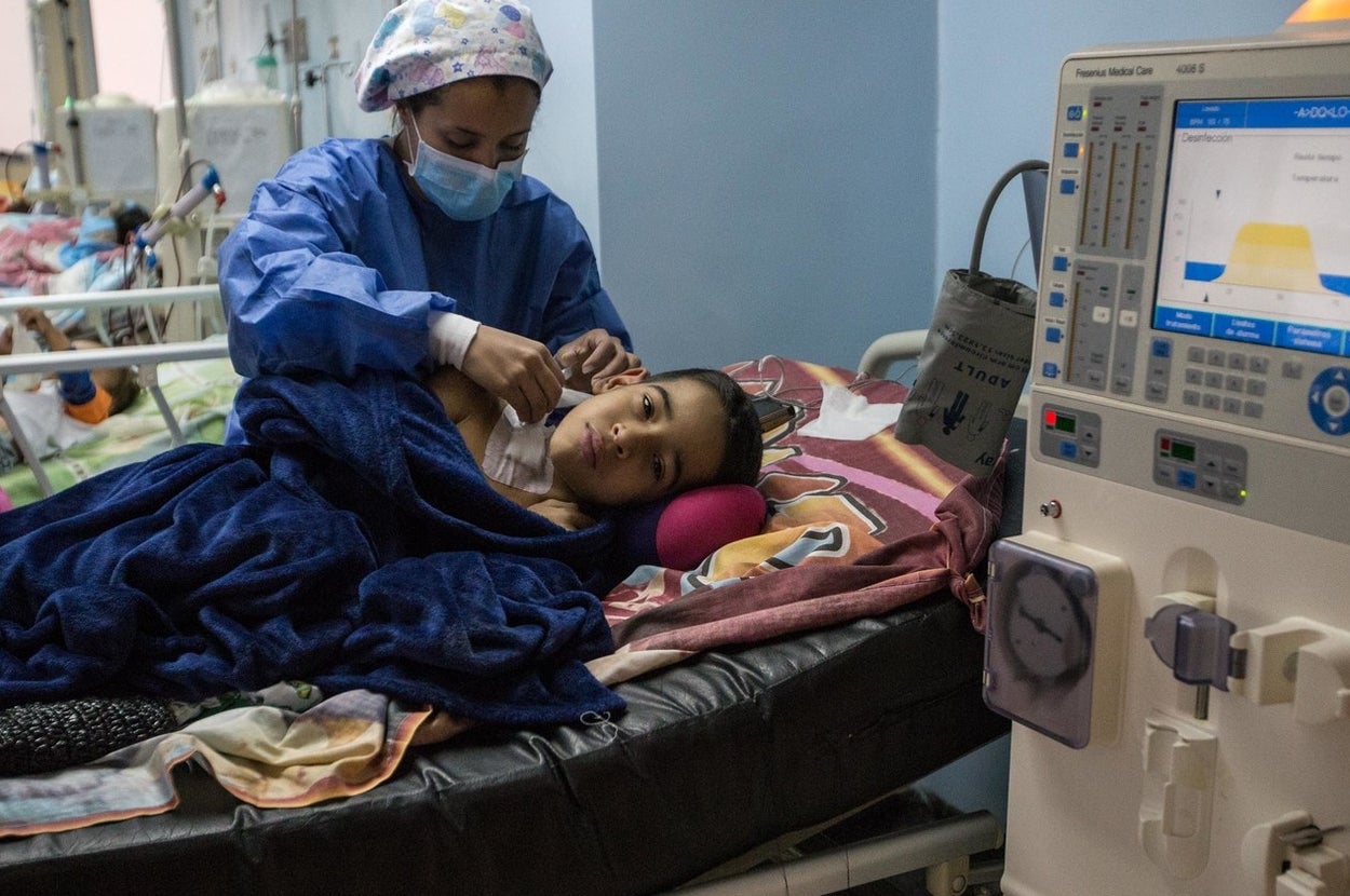 Una enfermera empujaba su silla de ruedas de regreso a la unidad de cuidados intensivos tras una sesión de diálisis de emergencia, haciéndole pasar a través de paredes desnudas y descamadas de azul y ascensores rotos. Cuando la tía de Maikol le apretó el hombro por el camino, él le tendió su brazo al cuello para acercarla.