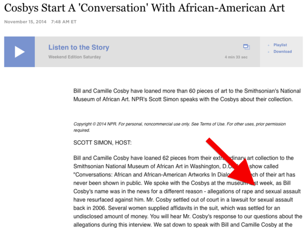 The topic was meant to be African art. But NPR’s Scott Simon took the opportunity to ask Cosby the obvious question. Since Cosby did not speak to the question, this quotation is all Simon: “This question gives me no pleasure, Mr. Cosby, but there have been serious allegations raised about you in recent days. You’re shaking your head no. I’m in the news business. I have to ask the question — do you have any response to those charges? Shaking your head no — there are people who love you who might like to hear from you about this. I want to give you the chance.”