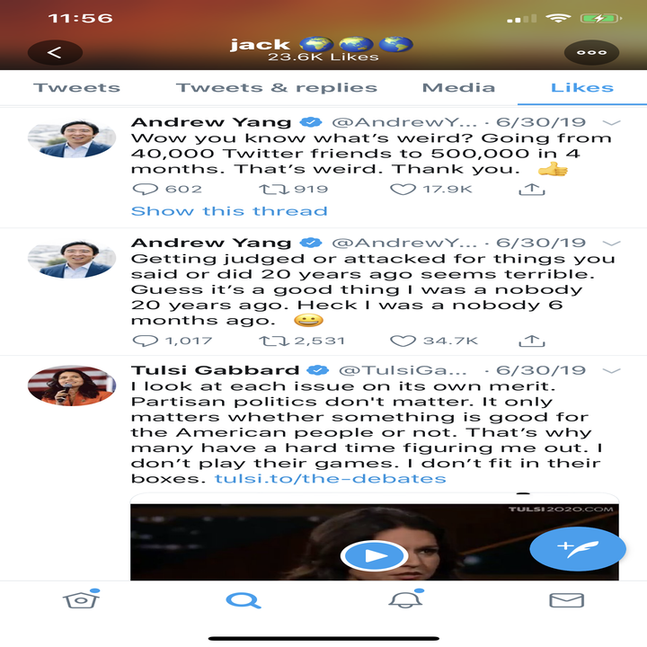 In the hours around the debate, Dorsey also faved a bunch of tweets from Gabbard or about her debate performance; of course, the true meaning of a fave is individual, and found in each of our hearts, but just for context.