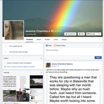 “It’s not about me,” the person who runs the Facebook group called Jessica Chambers Mystery said when I asked who they really were. My request to join one of the most active private groups was declined due to concerns about my own identity. “It’s been crazy with all the suspects online and trying to keep them from knowing what we are talking about in there,” explained the group’s leader, “RC” Barnes.