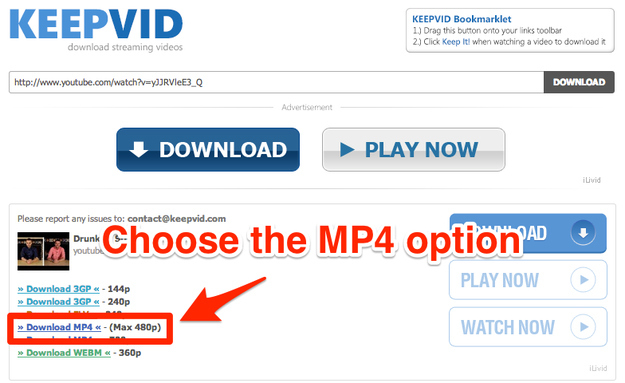9. Option B: Use a browser extension to grab the video. There are a lot of these, and they break all the time, so this isn’t 100% reliable. We recommend the KeepVid bookmarklet. On the YouTube page, click the bookmarklet to get to the download options: