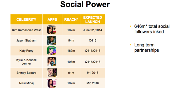 Minaj isn’t the only celebrity working with Glu. Britney Spears, Jason Statham, Katy Perry, and Kendall and Kylie Jenner are also developing games with the company. In its earnings presentation, Glu included a slide describing the social power of each of its celebrity partners.