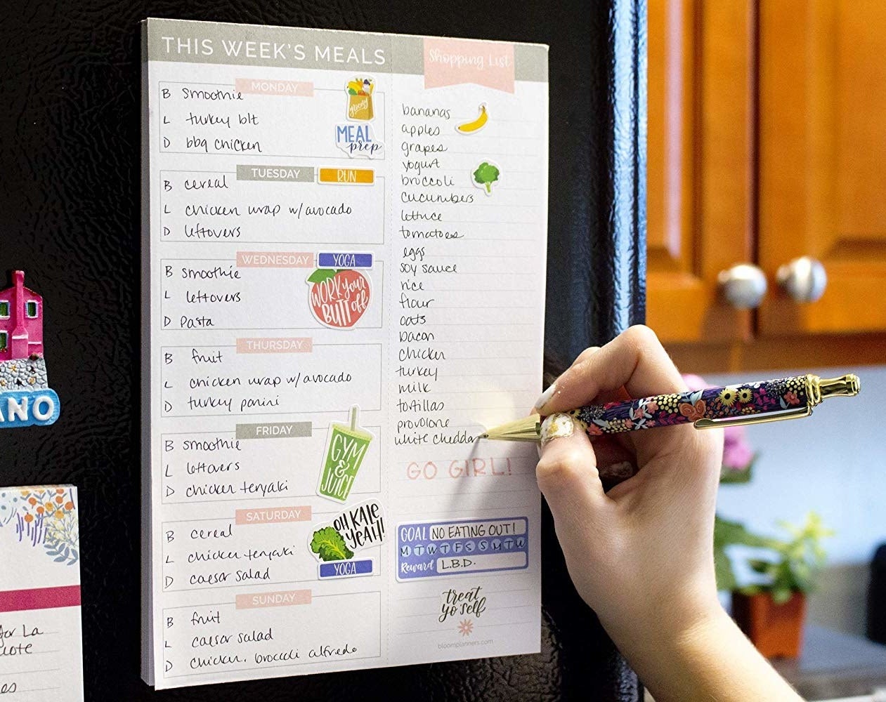 11. A genius meal planning pad to solve the struggle of actually figuring out what to eat. It lets you map out your munchies for every day of the week, make your shopping list as you go, then tear off the list when you're ready to hit the store. Plus, it's got magnets on the back so you can easily hang it on your fridge!