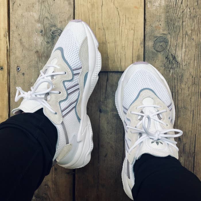 "My pair is mostly white with some beige details, reflective piping, and a few smaller lavender details. I like that they're pretty neutral and versatile without being too simple. I often wear them with leggings, but they also pair well with skinny jeans or even a casual dress. In addition to the wide range of colors and versatility, the technology makes them ~extremely~ comfy! Unlike many chunky sneaker designs, these are very lightweight. The inner layer is snug, stretchy, and hugs your foot like a sock. They're breathable and I never have to worry about them coming untied." —Kayla Boyd (check out her full Adidas sneaker review)