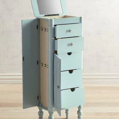 Get the breakfast table set for $424.95, the jewelry armoire for $279.95, and the ottoman for $169.95 (available in eight colors).