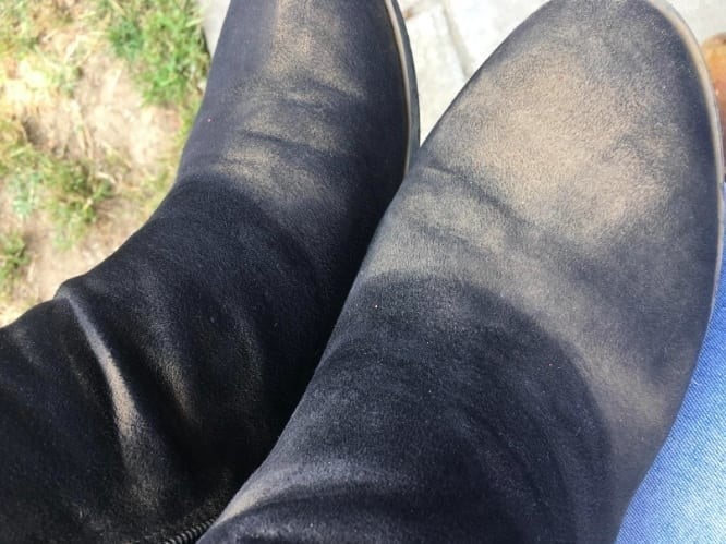 Promising review (for the above photos): "I ordered this brush hoping it would be able to clean my faux-suede boots after a night of dancing in the dirt! To my surprise (but huge relief!), this small but handy brush got the job done! 98% of the dirt came off and even though my boots aren’t as dark black as they were before, this brush has allowed them to be wearable again! I give 5 stars!" —Melissa
