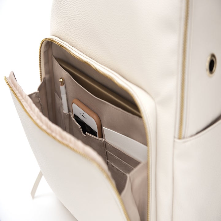 3.A vegan leather backpack that comes with handy travel features like a padded pocket for laptops and phones, a horizontal back strap that can easily slide onto luggage, and a separate pocket for power banks. But wait — this backpack *also* comes with a powerful portable battery so you can literally charge as you go. TL;DR: It has EVERYTHING.