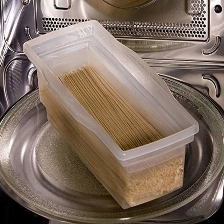 10. A microwave pasta maker that'll cook, strain, and create a full meal for you while you sit on the couch and catch up on all your shows. You know, the important stuff.