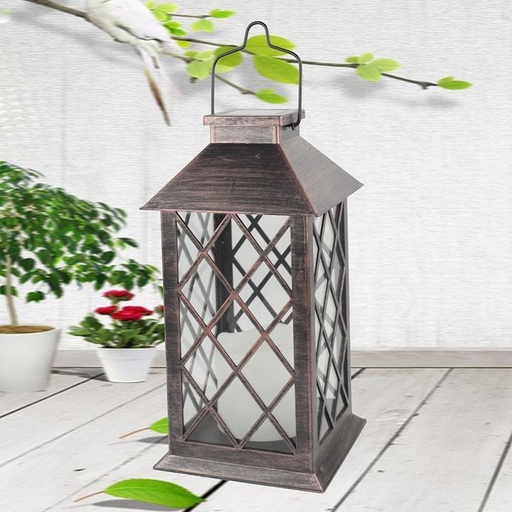5. Light up your porch or walkway with a small solar-powered lantern. The candle has an LED light that flickers like a dancing flame, creating soft and subtle outdoor lighting. The lantern also has a handle, so you can hang it, too!