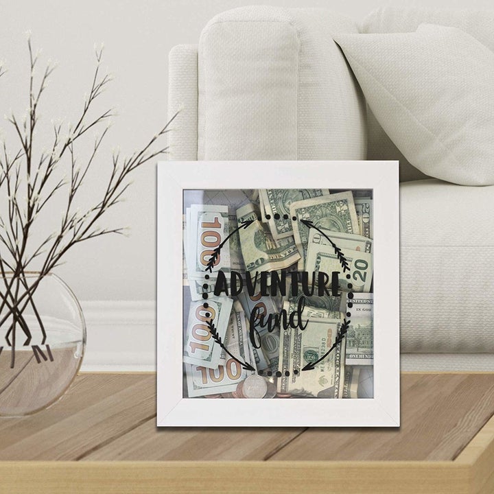 3. A travel fund, so your BFF can save up for their next plane ticket to your city. The shadow box has a slot at the top to put money in, and a set of saw tooth hangers on the back if you want to mount it.