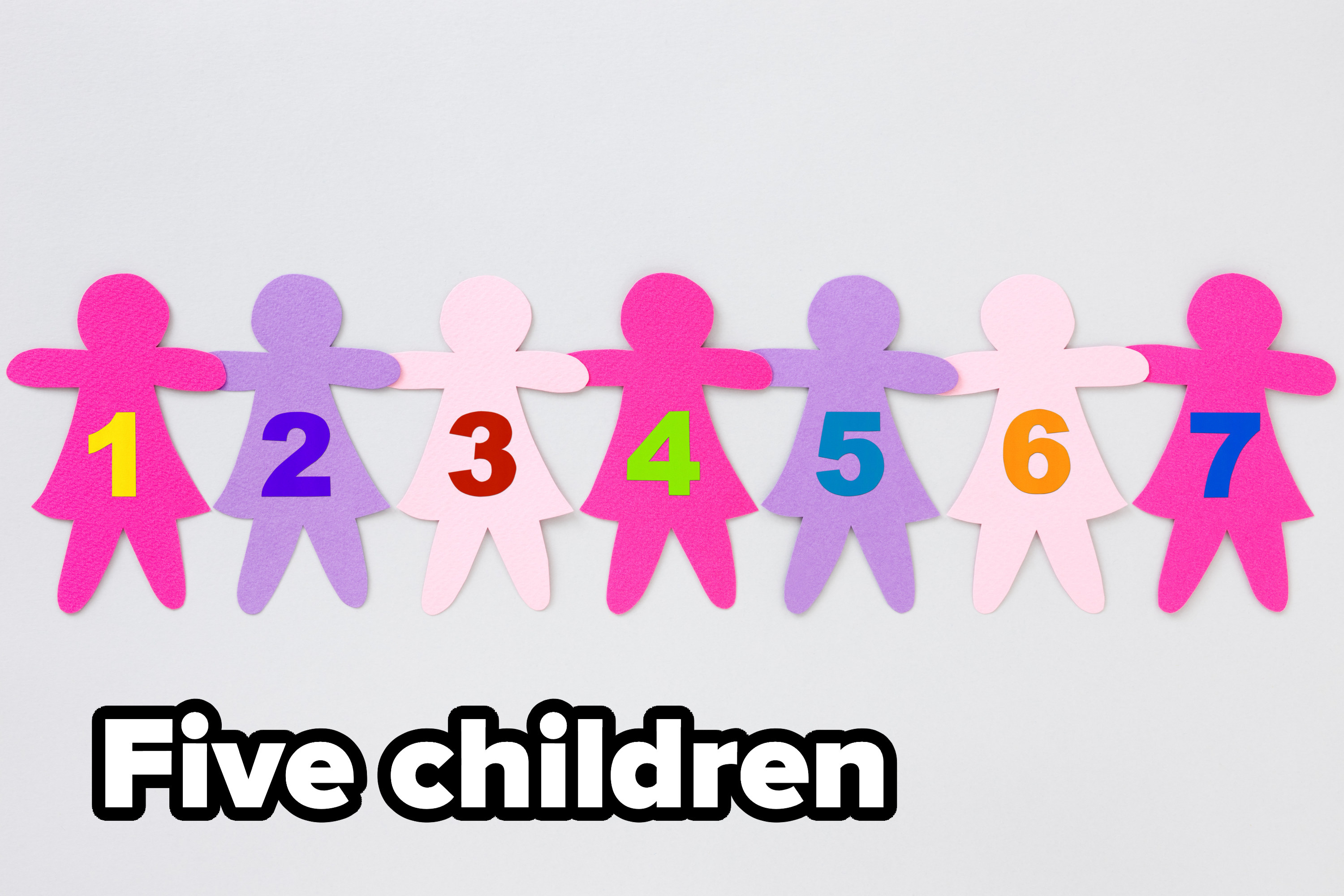 Paper cuts of girls in pink shades holding hands side by side and all with numbers on them