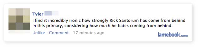 This post has not been vetted or endorsed by BuzzFeed's editorial staff. BuzzFeed Community is a place where anyone can create a post or quiz. Try making your own!Buzz·Posted on Feb 22, 2012Rick Santorum Coming From BehindMeh!by koolnewsblogCommunity ContributorFacebookPinterestTwitterMailLink