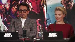14. And finally, during an Avengers press conference, a reporter asked Robert Downey Jr. about his character arc, then asked Scarlett about her diet.