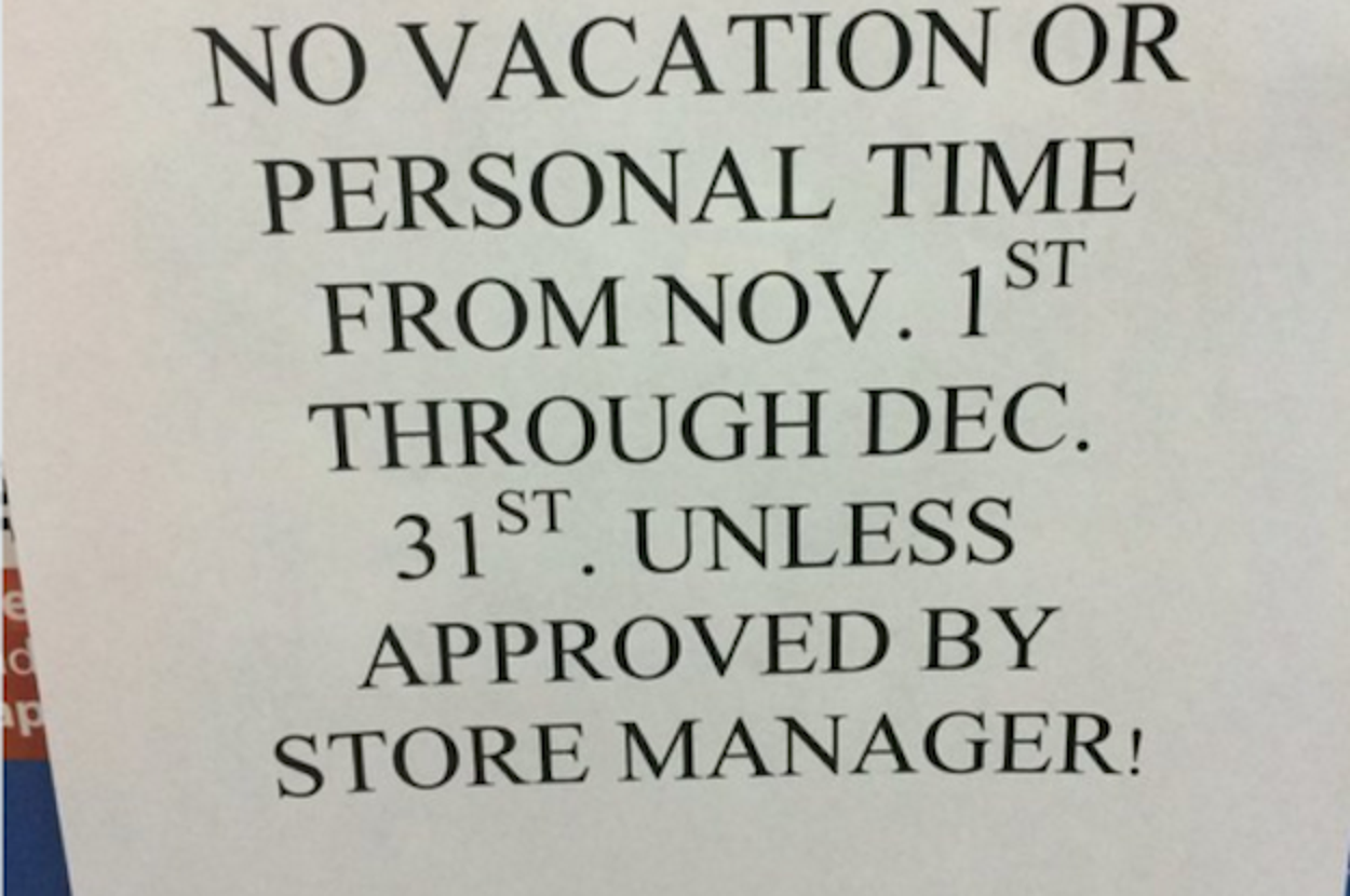 Our annual "don't even think about it" holiday days off notice - welcome retail hell. #retailproblems