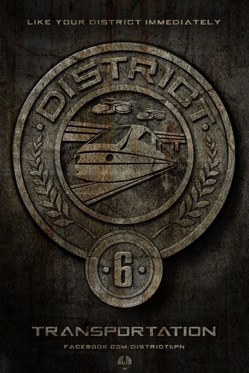 District 6: "Our hovercraft, our high-speed trains, and our cargo trains come to us from District 6. Ironically, the citizens here have little love for travel."