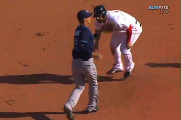 During today's Boston Red Sox — Tampa Bay Rays game, Sox catcher Kelly Shoppach pulled off a truly bizarre, deranged slide. It sort of comes in three acts, each with its own narrative arc; remarkably ends with Shoppach safe on base; and is unlike anything you've ever seen before.