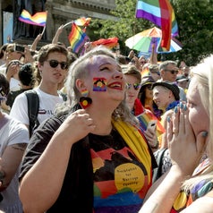 Back in Parliament House, a group of MPs and senators watched the announcement on TV. Penny Wong, who has two children with her partner Sophie Allouache, buried her face in her hands, crying, seconds after the result came down. Tim Wilson also watched on with his partner, Ryan Bolger, who he has been engaged to for seven years.