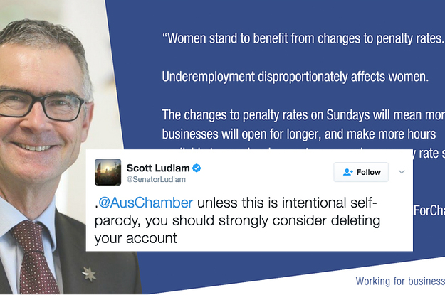 .@AusChamber Happy International Women's Day from the people who want to cut our pay. The same ppl who DO NOT work weekends. Bravo. #fail