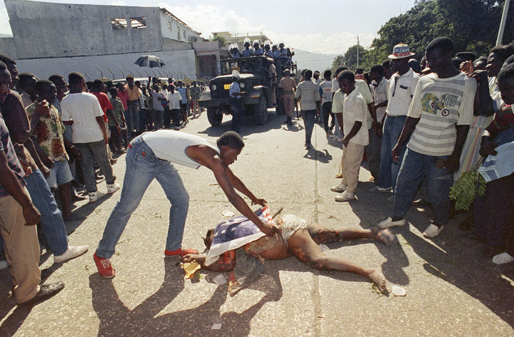 A man drapes a flag over the body of a pregnant woman who was shot and killed, Monday, Dec. 18, 1990 in Port-au-Prince while celebrating the election victory of Jean-Bertrand Aristide. Scott Applewhite / ASSOCIATED PRESS
