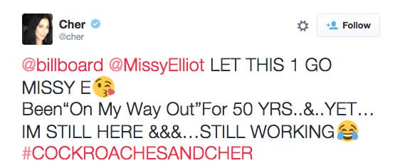Then Cher (the world's most beloved Twitter user), after seeing this devastating confession from Missy, replied to the tweet with her wise words.