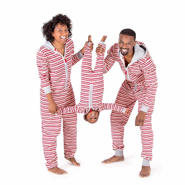 Get them from Amazon for $9.95+ (red striped onesies here and blue and grey PJs here; available in sizes for baby, toddler & kids, big kids, adult men and women, and dog/cat)