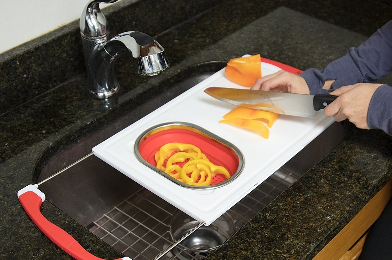 30.An over-the-sink cutting board with a build-in strainer so you can rinse, and chop your produce in the exact same space. This bb is especially great for anyone with a tiny kitchen and no counter space.