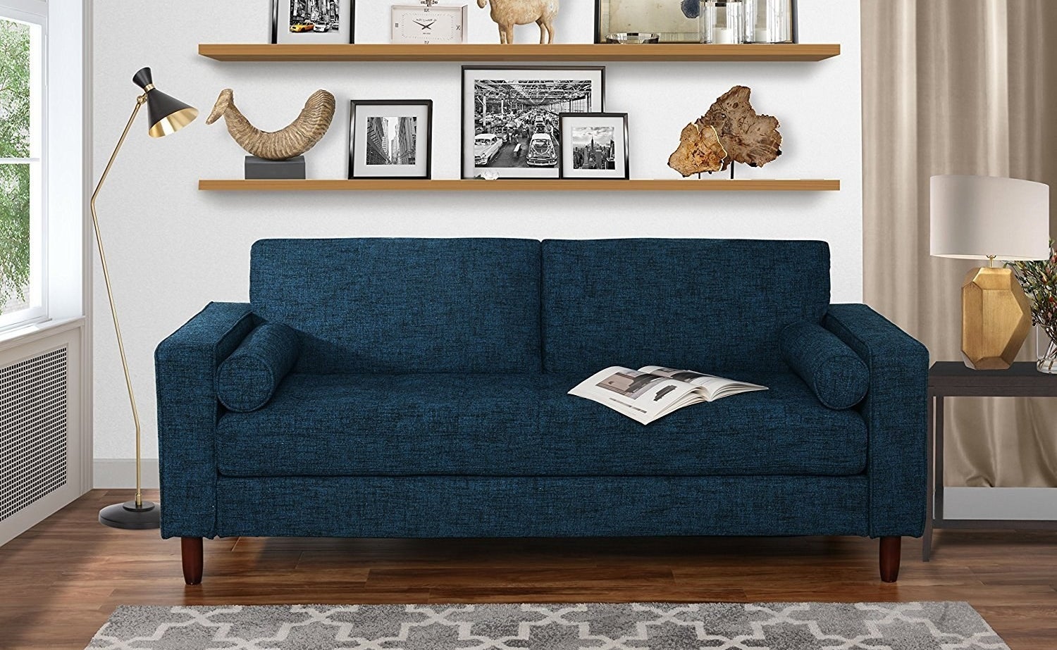 12. A dark blue linen sofa made with high density foam, for anyone who firmly believes in a firm sofa.
