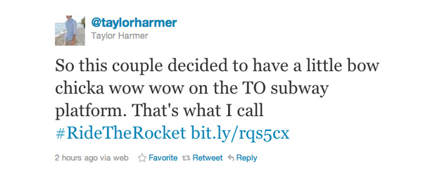 Yesterday at 2:30pm in Toronto a couple was caught having sex on the subway before they moved to have sex on the platform. WorldStarHipHop has the video. Beware, it's totally NSFW. Since the video was posted, people have taken to Twitter to tweet their thoughts using the hashtags #TTC, #RideTheRocket and #MetroSexualPass, here are some of the best tweets. FYI, Ride the Rocket is the actual slogan for the TTC.