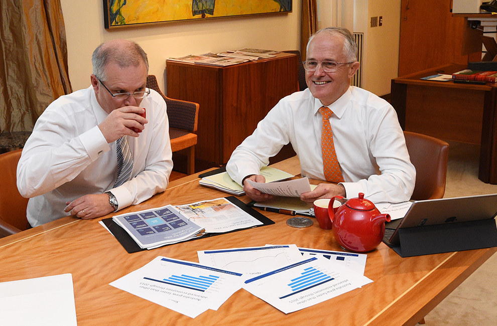 These photos can be disastrous. Last year, then-prime minister Tony Abbott and his treasurer Joe Hockey took this gloomy picture.