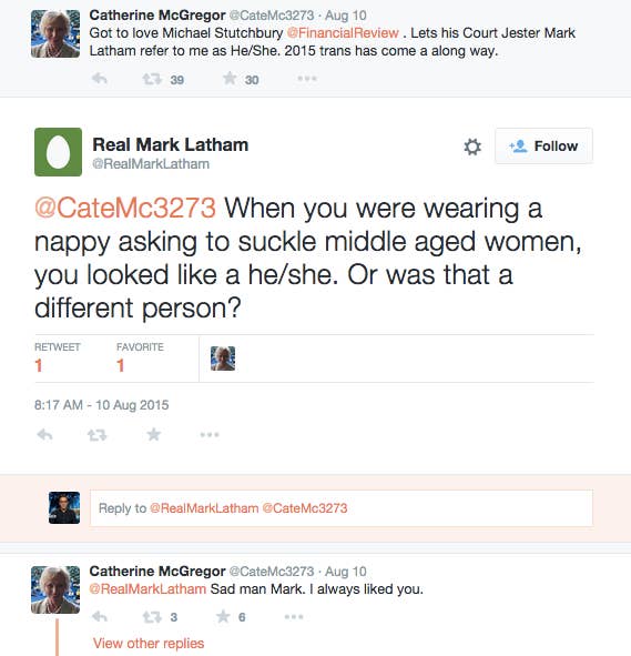 Group Cpt. Catherine McGregor was driven off Twitter last week when she brought up an old Mark Latham column and was abused by the @RealMarkLatham account.