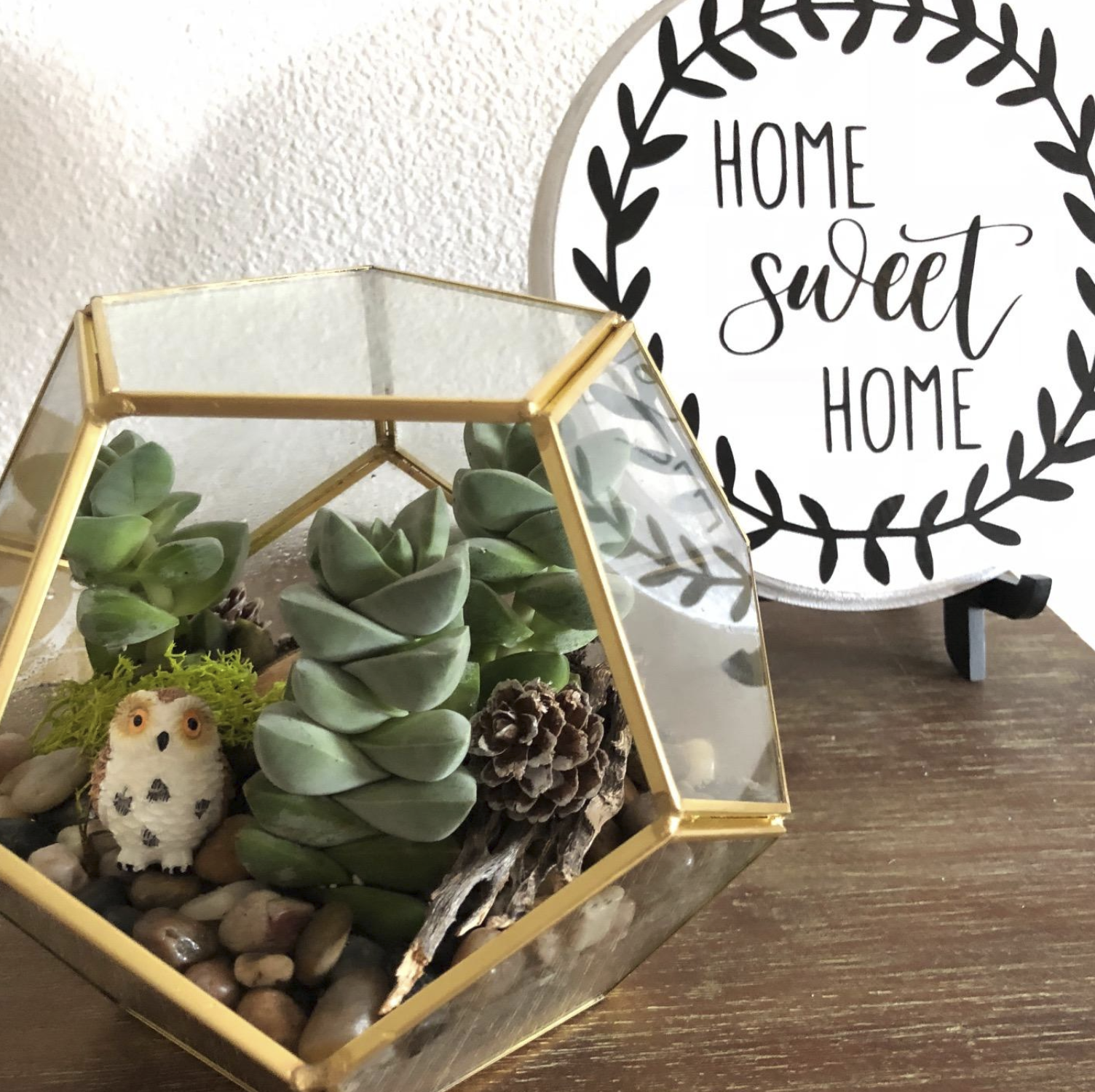 9. Or a stationary glass pentagon terrarium to fill up with your real or faux plants and set it on a desk, coffee, table, dresser, or any other surface.