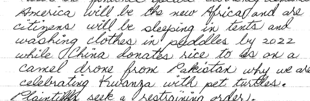 “America will be the new Africa and are [sic] citizens will be sleeping in tents and washing clothes in puddles by 2022 while China donates rice to us on a camel drone from Pakistan why we are celebrating Kwanza with pet turtles.”