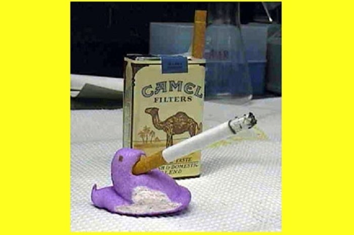 Modern scientific advances have led to a greater understanding of the entity we know as "the peep." Here we see some studies delving into the effects of cigarettes and alcohol on the beloved candy snack. Remember, peeps: just say no.