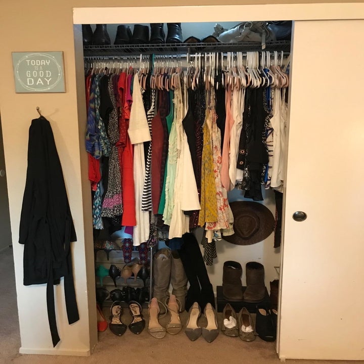 22. Hang your most-used flats, sneakers, sandals, and heels in an over-the-door shoe organizer. As long as there are open slots, you can carry on with your shoe-shopping bad habit.