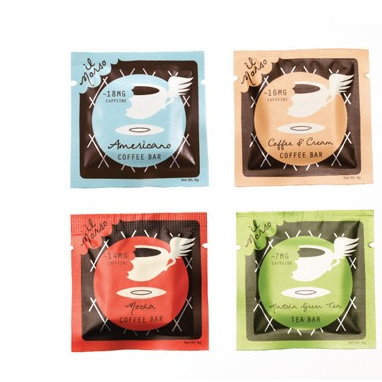 The makers say each square packs the caffeine equivalent of 1/2 an espresso. More info on monthly packs here.
