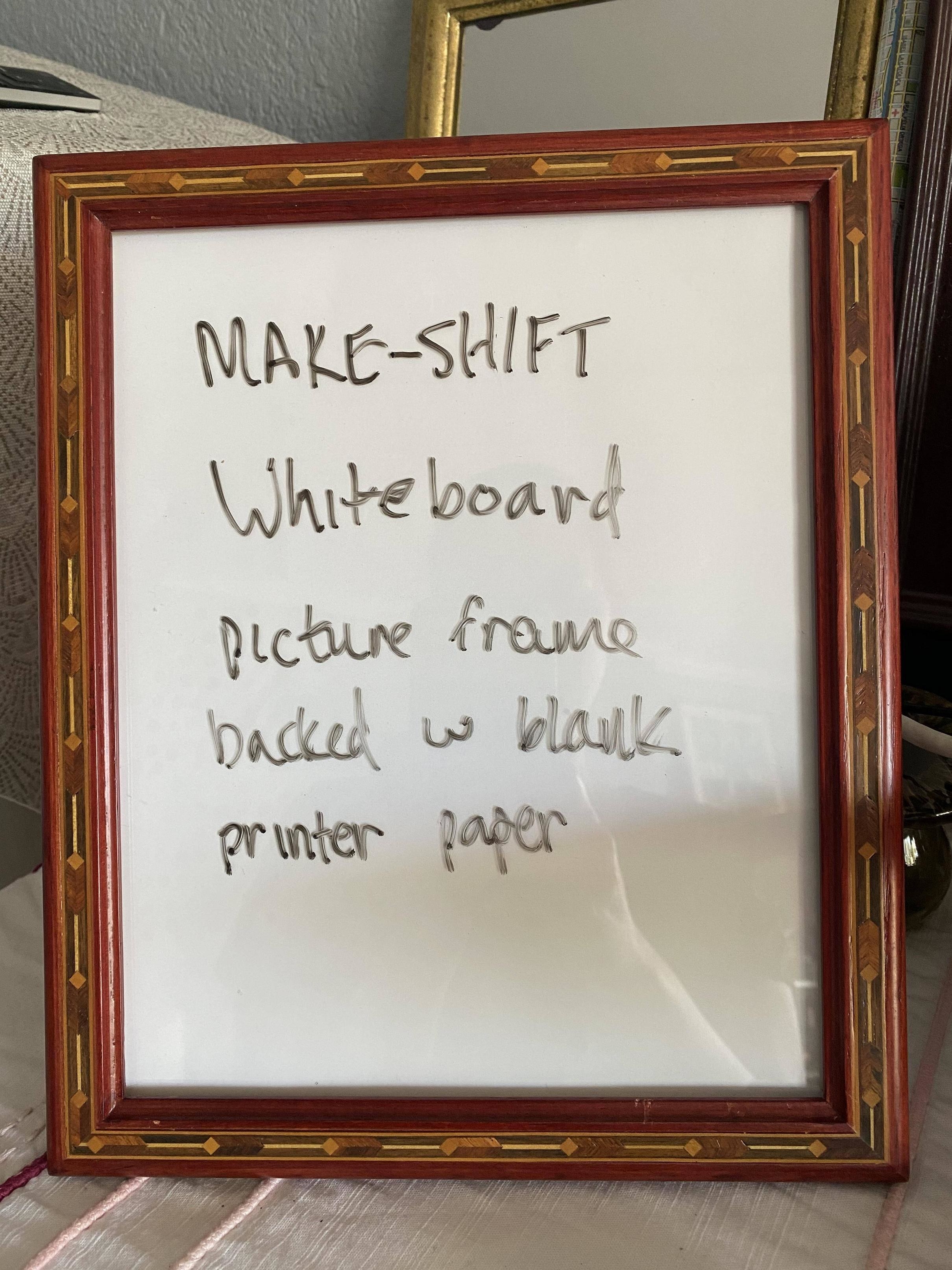6. Don't have a whiteboard? DIY one with an empty picture frame β or a laminate sheet β with a blank piece of paper inside.