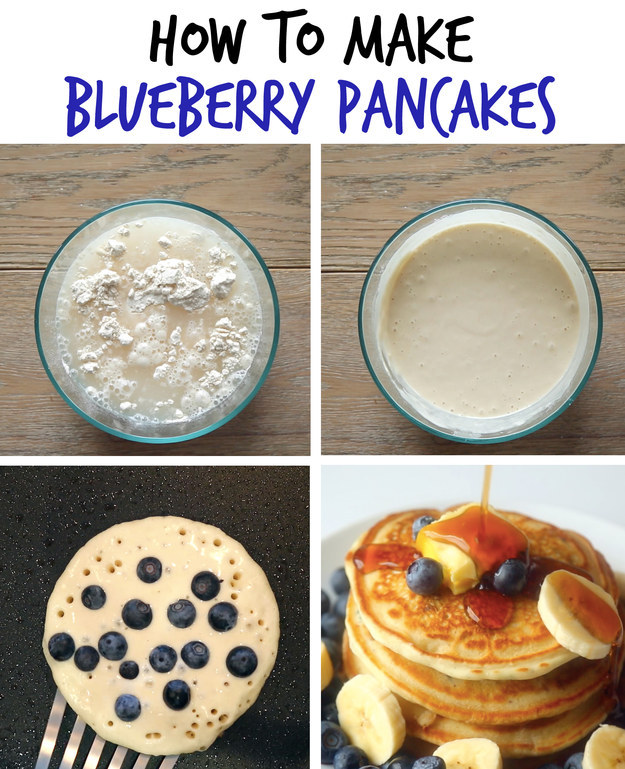 Heat a large, nonstick skillet over medium heat. Pour ¼ cup batter into the skillet to make a pancake, repeating as many times as will fit in the skillet. Sprinkle a handful of blueberries on top, and cook until the edges are light brown and bubbles start forming near the middle, about 2 minutes. Flip, and continue to cook for another 1-2 minutes. Serve with bananas, syrup, and butter.