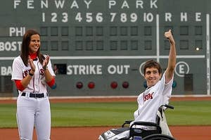 Jeff Bauman, who survived the Boston Marathon bombings, threw out the first pitch at tonight's Boston Red Sox game.