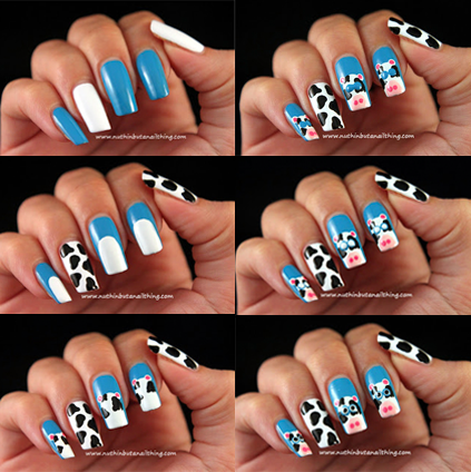 So, you just paint three nails blue and two nails white. Then paint on your black cow print and start building up the cow faces bit by bit – starting with a plain white face, then adding drops for the ears before adding some cow print and building up dots for the nostrils and eyes.
