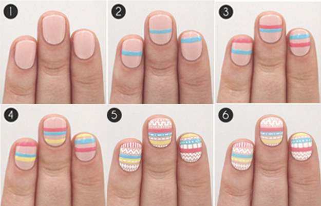 Start with a nude base and then build up with a range of pastel-coloured stripes and fill in with fine, white paint.