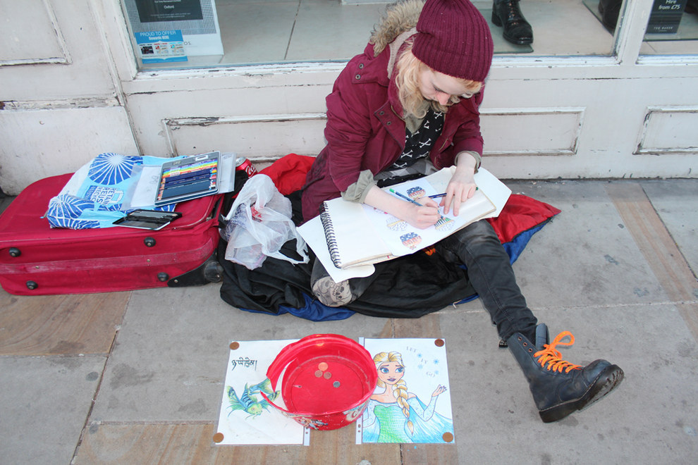 The sun has set on the first warm Saturday in May, and Nancy, 29, is sitting up against a wall on Cornmarket Street in Oxford’s city centre, trying to shake the evening chill and collect a few pounds from her sketches. Pedestrians stream past as she concentrates on her latest drawing: Elsa from Frozen and the words “Let It Go”.