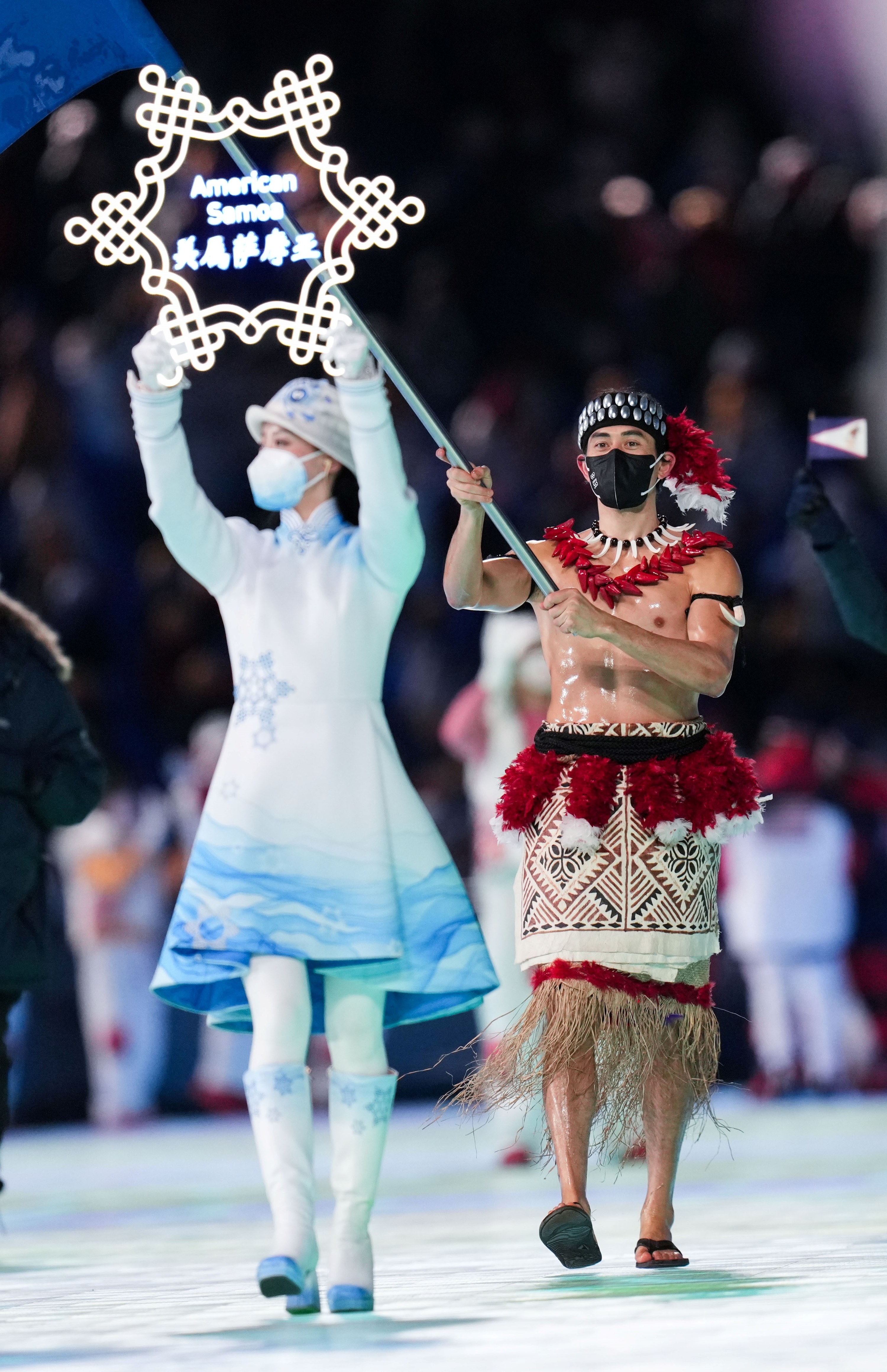 Luckily for us, there was another shirtless flag bearer from American Samoa.