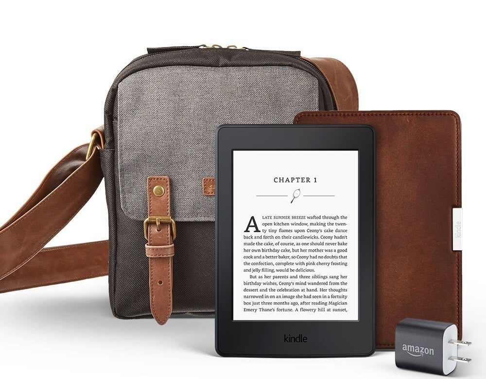 25. A Kindle bundle with a leather cover, power adapter, and a travel bag so he can always read on the go.