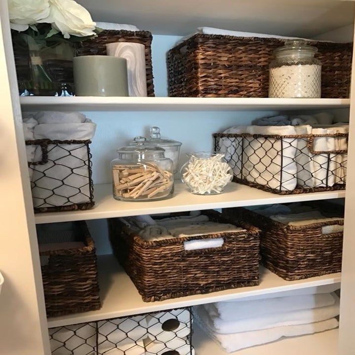 15. Transform your linen closet or bathroom closet with the help of a few baskets.