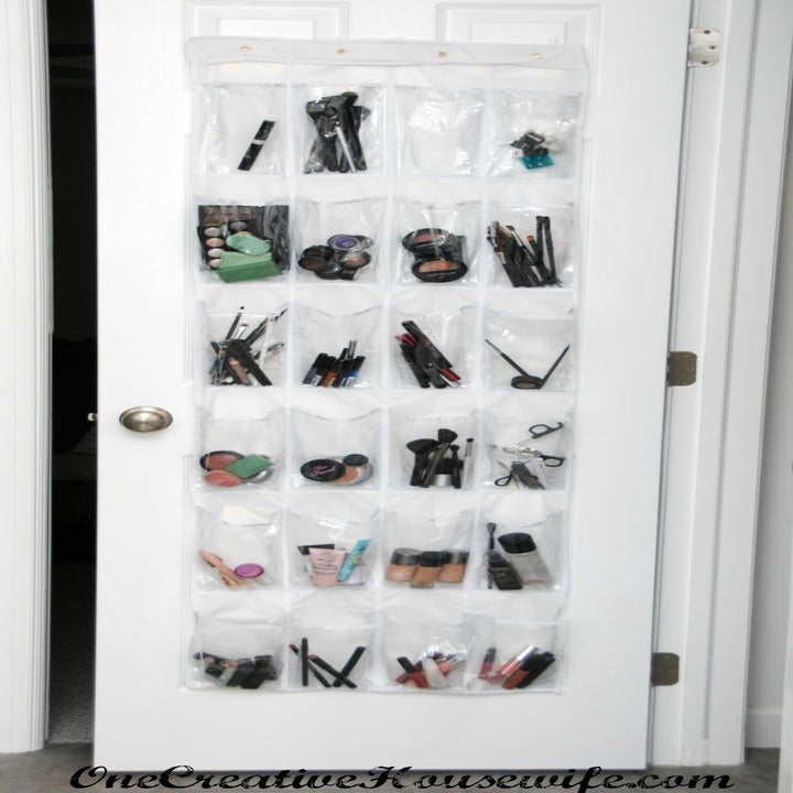 3. Hang an over-door shoe organizer in your bathroom to organize makeup, hair tools, lotions, toothpaste...the list goes on.