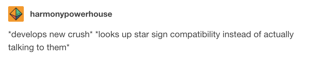 *develops new crush* *looks up star sign compatibility instead of actually talking to them*