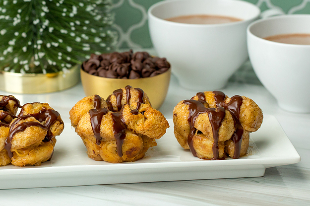 5. Place 4 biscuit pieces in each muffin-tin space. Pour a small spoonful of butter mixture over them, then add 4 more biscuit pieces and another spoonful of butter. Repeat until muffin tin is full (each muffin should have a total of 8 biscuit balls).