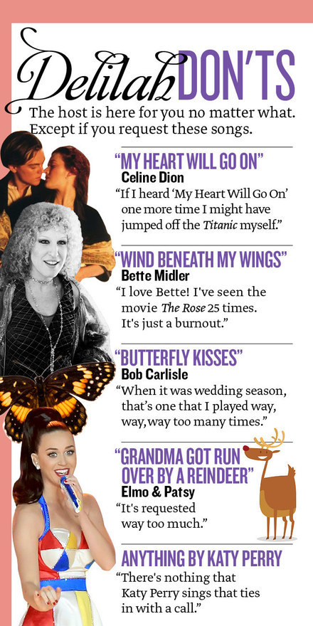 Bette Midler’s “Wind Beneath My Wings” remains Delilah’s most-requested song, even though she hasn’t played it in years. “If I never hear that song again, it will be too soon,” Delilah says, noting, “I’ve seen the movie The Rose 25 times.” Bob Carlisle’s “Butterfly Kisses” and Celine Dion’s “My Heart Will Go On” have been similarly skunked: “During the Titanic era, if I heard ‘My Heart Will Go On’ one more time I might have jumped off the Titanic myself.”